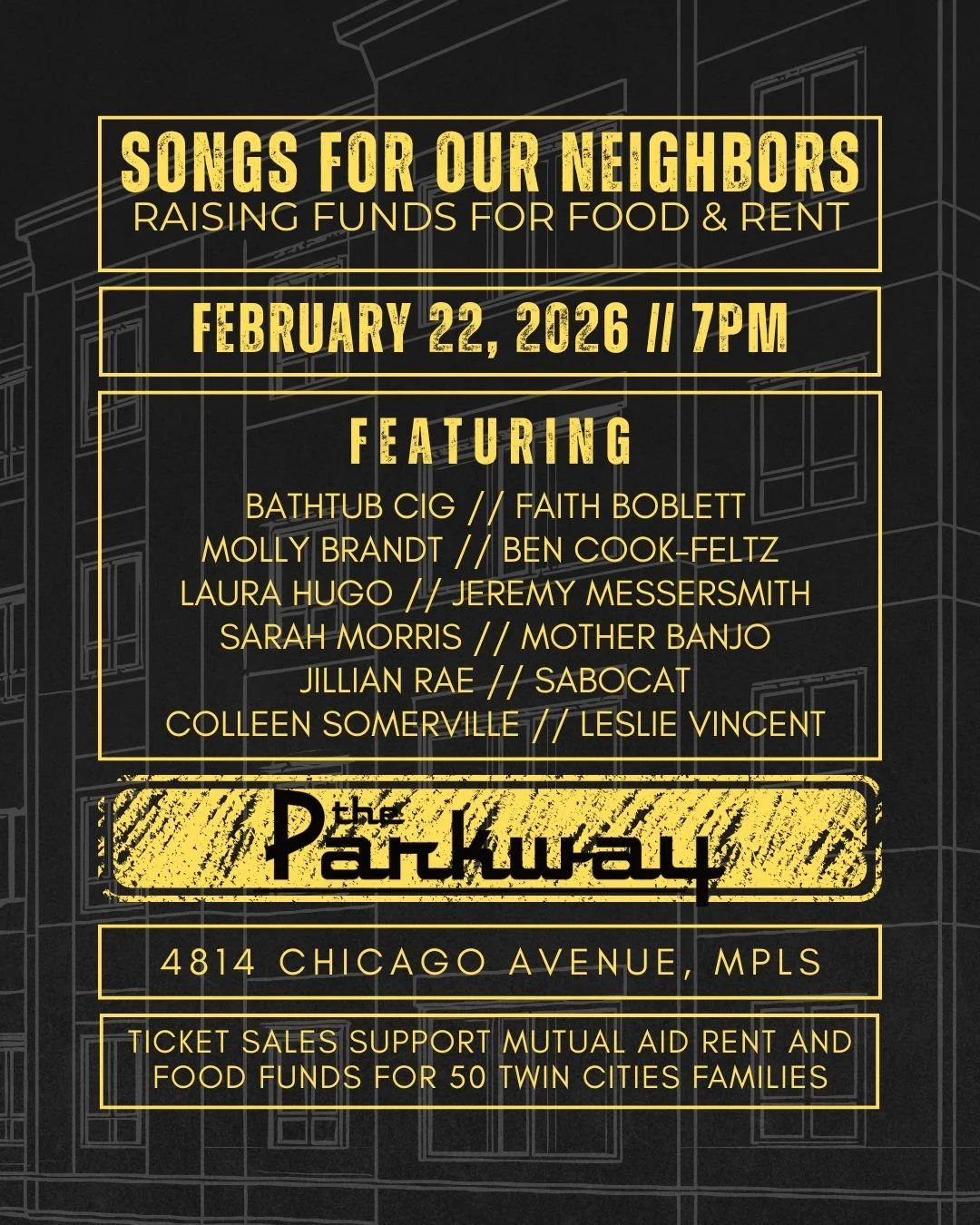 Your donations will go toward mutual aid rent and food funds for fifty Twin Cities families who need our support right now. Featuring performances by a fantastic line-up of local artists, including bathtub cig, Faith Boblett, Molly Brandt, Ben Cook-Feltz, Laura Hugo, jeremy messersmith, Sarah Morris, Mother Banjo, Jillian Rae, Sabocat, Colleen Somerville, and Leslie Vincent.