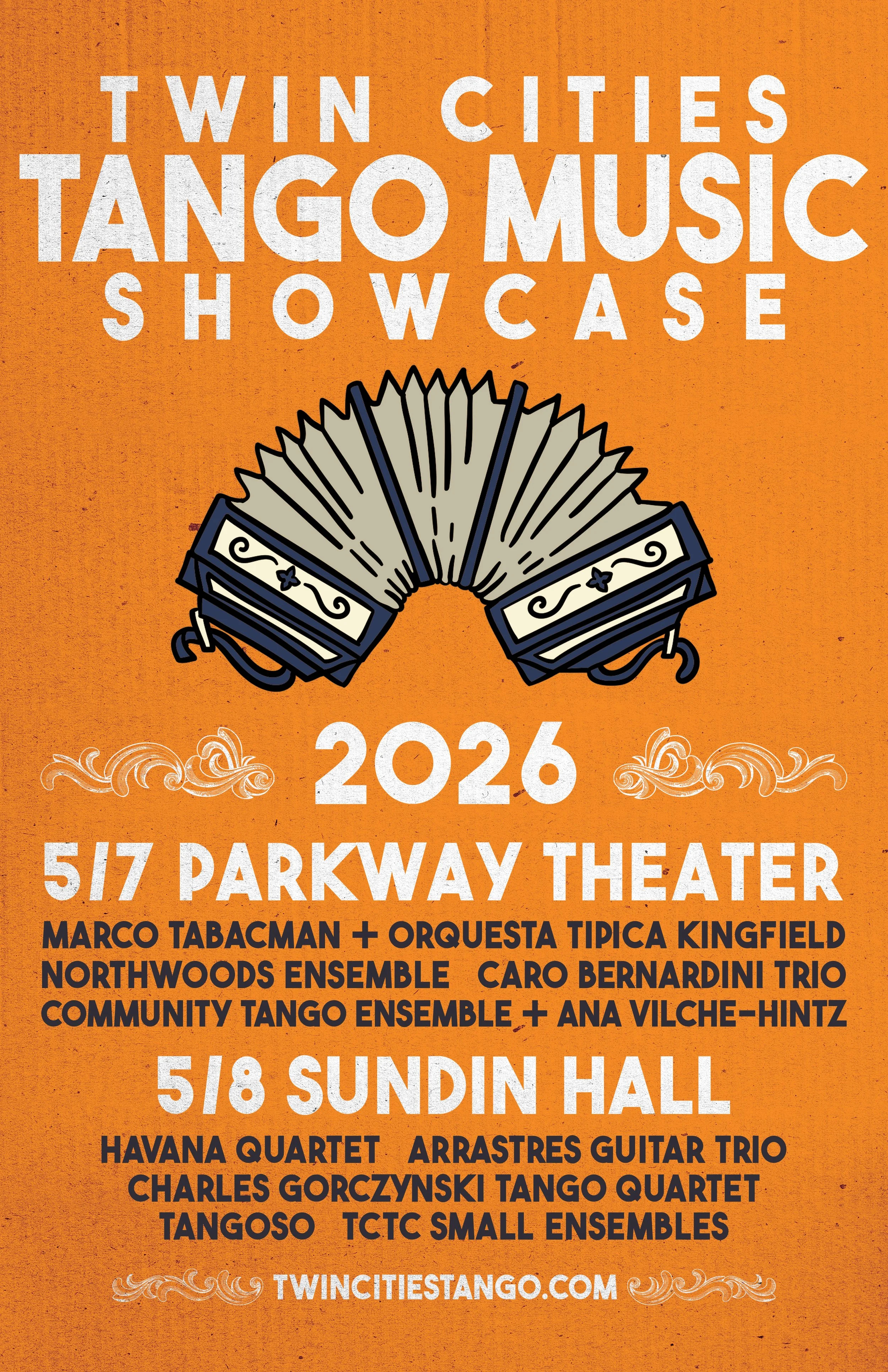The Twin Cities Tango Music Showcase presents over 45 musicians in orquesta tipicas and small ensembles, performing the work of legendary tango composers Aníbal Troilo, Osvaldo Pugliese, and Astor Piazzolla, along with the work of contemporary composers in Buenos Aires. Featuring performances by Orquesta Tipica Kingfield, Marco Tabacman, Caro Bernardini Trio, Northwoods Tango Ensemble, and Community Tango Ensemble. With only one showcase in 2026, not to be missed!